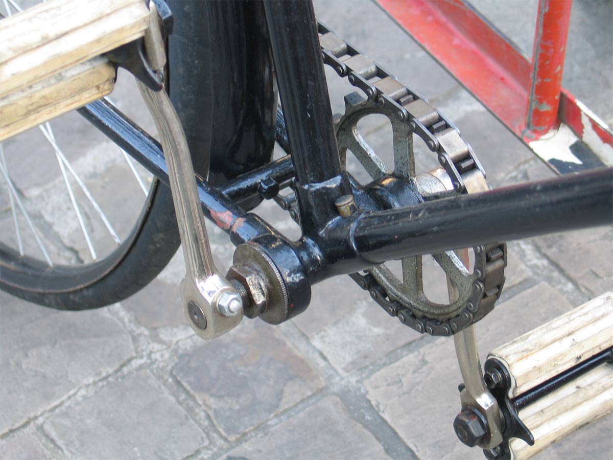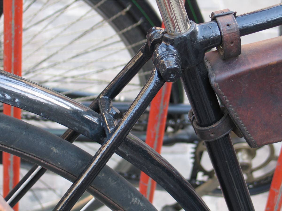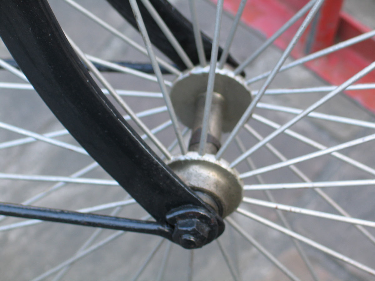 This 1892-model Sparkbrook has the ten modern diamond frame. It retains the old model bracket (not yet a straight tube, position of bearings clearly visible) and the cushion tires.