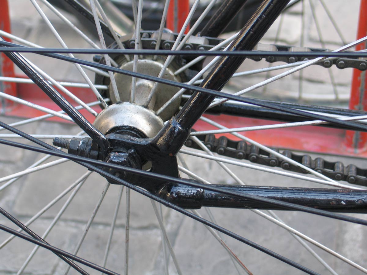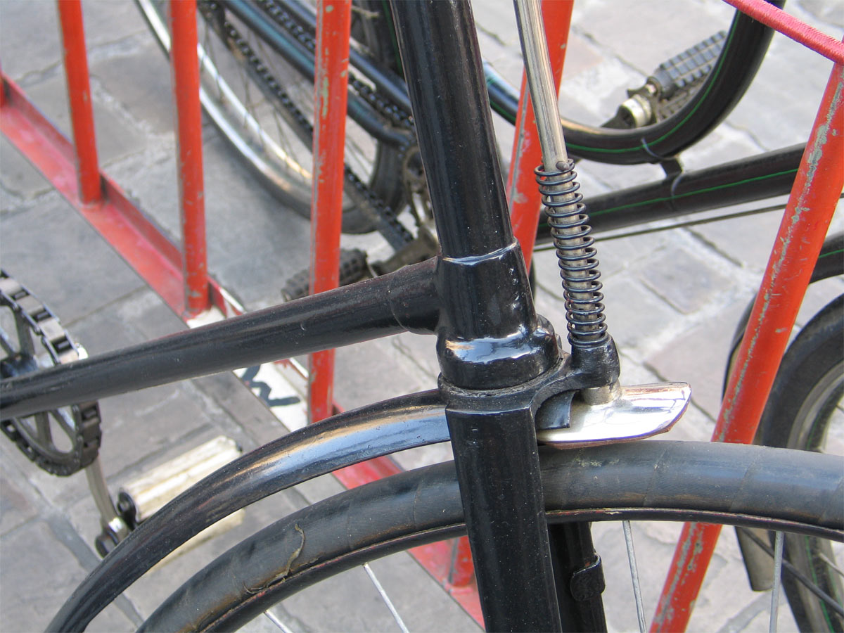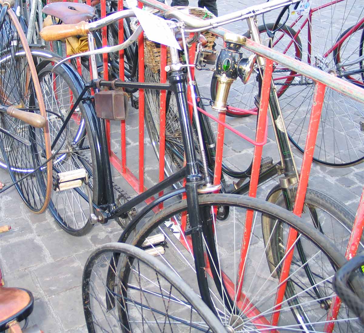 This 1892-model Sparkbrook has the ten modern diamond frame. It retains the old model bracket (not yet a straight tube, position of bearings clearly visible) and the cushion tires.